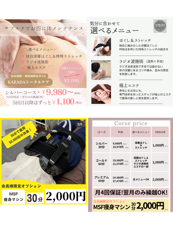 淀屋橋にてサブスク定額制サロン「KARADAトータルケア」オープン (2023年1月4日) 2023年1月4日より淀屋橋にて、当店初の業態となります、サブスクシステムによるサロン 「KARADAトータルケア」をオープンしました。 当店は、25年あまりの整骨院での経験から、どうしても整骨院では出来ることが制限されてしまうもどかしさがあり、もっと満足していただけるよう業界でも珍しい定額制のサロンをオープンさせて頂きました。 当店の特徴は、頭の先からつま先まで体全身の痛みや不調・悩みを本気で解決させ体を整える会員定額制のサブスクで、お1人お1人の体に合わせた専属メンテナンスを致します。 定額制で定期的に通って頂くため、体を元に戻さず良い状態が維持できます。 あなたの悩みに合わせて、その日の気分でメニューが選べるお得なシステムです。 1.プロの技で、コアまで届く独自の深層もみほぐし手技技術と、ヨガの呼吸法で行なう 特殊ストレッチというマッサージとストレッチを組み合わせた2刀流施術で人それぞれの体の構造や人間の体のサイクルの中で施術致します。 2.手技ではなかなかよくならない、体の深層の届かない箇所も、ラジオ波を用いて温熱✖️手技で施術します。 3.最新機器を取り入れた極上エステや、専門技術を持つスタッフによるオイルマッサージ 頭皮に特化した施術など、究極の美を追求いたします。 当店のエステは男性スタッフも在籍しておりますので、男性の方にもご好評頂いております。 また会員様限定オプションとして、30分寝てるだけで腹筋50000回の効果があるとされているMSF痩身マシンが30分2,000円(税抜)で‼ この破格はサブスクだからできる当店だけのお得オプションです。 他にも5回目以降は、ずっと1,000円(税抜)。 10分追加1,000円(税抜)で可能。 一部単品メニューが10分1,000円(税抜)など 会員様だけのオプションサービスが充実。 ぜひ当店で色々お試し下さい。 ジムやヨガに通うように、週に1度通って頂くだけで、変化を実感して頂けるはずです。 今なら施術体験¥3,000のところ¥2,000で!また2週間以内の入会なら入会金¥0でOK! 1度、体験だけでもお試し下さい。 ご予約はこちらから↓ https://karada-totalcare.com/ 大阪市中央区高麗橋4-5-12 テラソマビル3階 淀屋橋駅徒歩3分 肥後橋駅徒歩3分 |